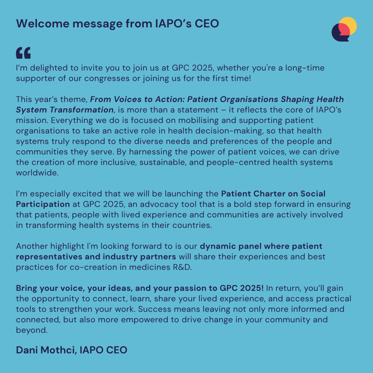 This year's congress marks over 25 years of IAPO’s bold leadership, relentless innovation, and global collaboration as the pioneering and most established global alliance of patients' organisations. To celebrate this milestone, GPC 2025 features an inclusive, patient-led approach that highlights real-world experiences and the strength of our global patient organisation community.