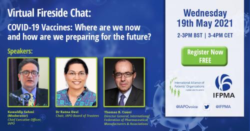 The International Alliance of Patients’ Organizations ( IAPO) in collaboration with the International Federation of Pharmaceutical Manufacturers & Associations (IFPMA) is organising an event on Wednesday 19 May 2021, 2 pm -3 pm BST | 3 PM – 4 pm CET as a follow up on industry’s COVID-19 Vaccine development status updates at the 9th Global Patients Congress in September and the 2nd Asia Pacific Patients Congress in December 2020.