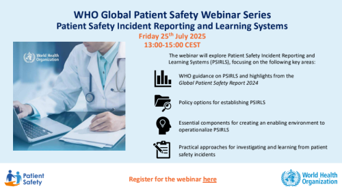 The World Health Organization (WHO) invites you to join the next session of its Global Patient Safety Webinar Series, focused on Patient Safety Incident Reporting and Learning Systems (PSIRLS) - a cornerstone of safe healthcare delivery.
