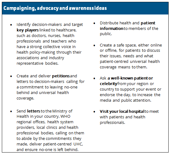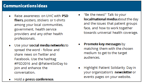 We have put together a list of ideas to help you show your support using as much or as little time and resources as you can spare. Patient-centred healthcare can be promoted and supported in multiple ways. It is up to you to choose the ones that you feel can have the strongest impact. You don’t need lots of money to make a large impact and to show your solidarity. Be creative and think of ideas not listed here too!